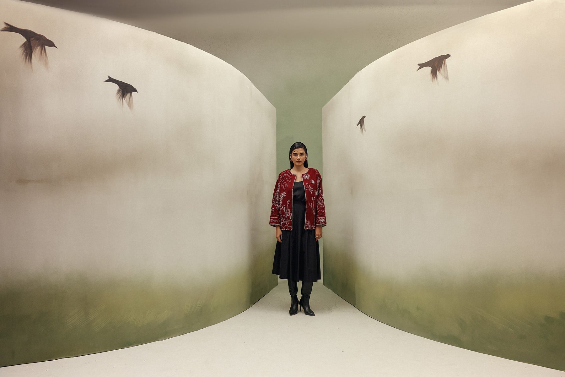 Embroidery inspired by collection motifs adds artisanal texture and visual detail