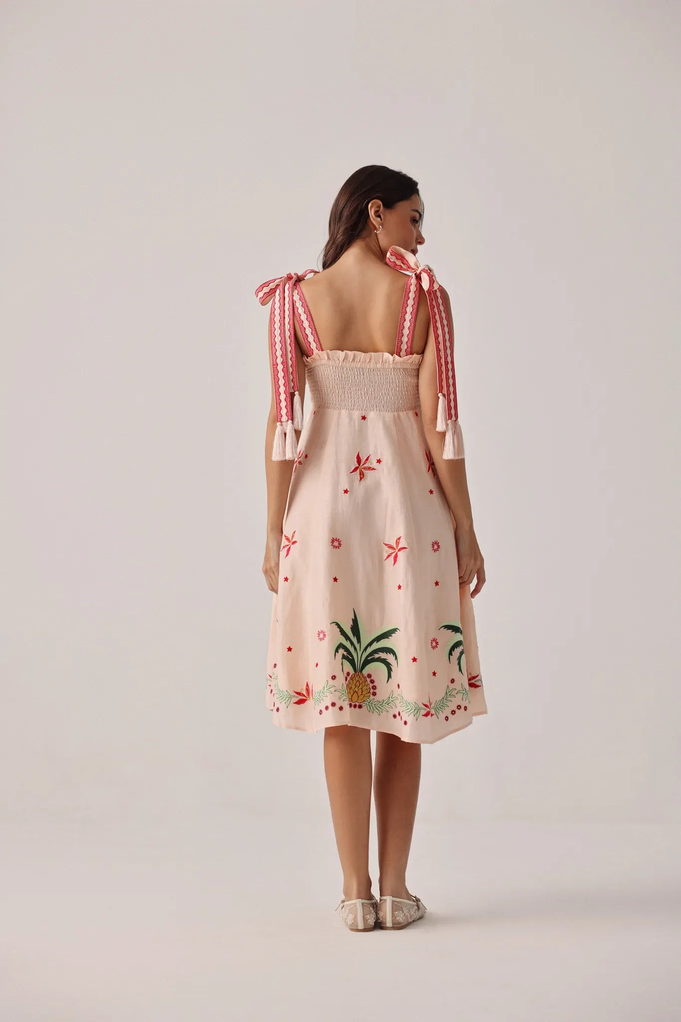 Sleeveless midi dress silhouette with tie-up straps finished with handmade tassels
