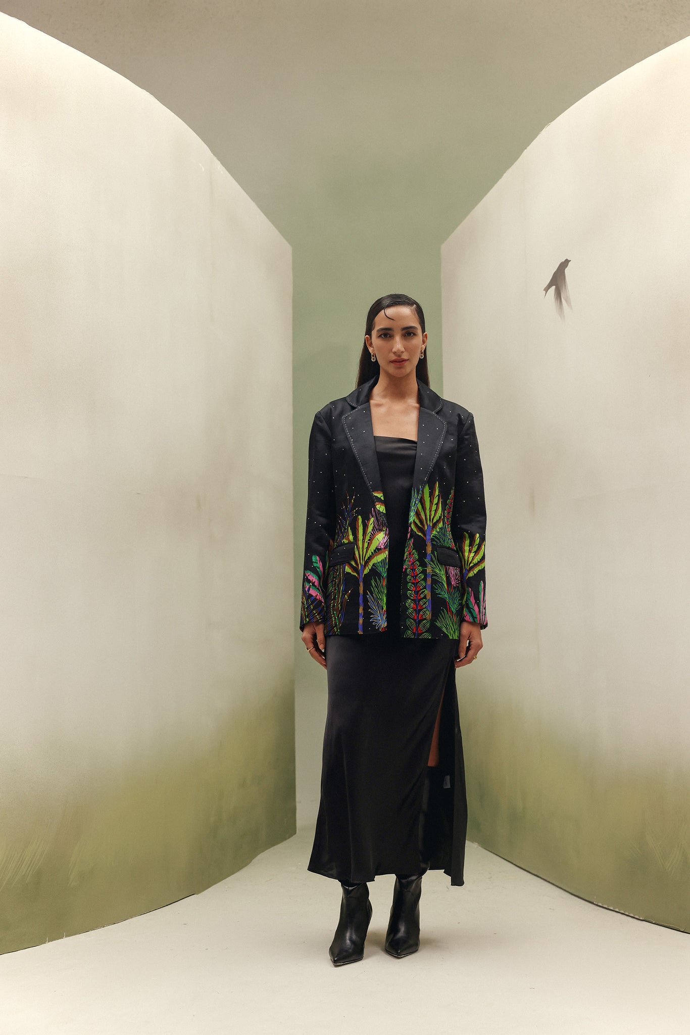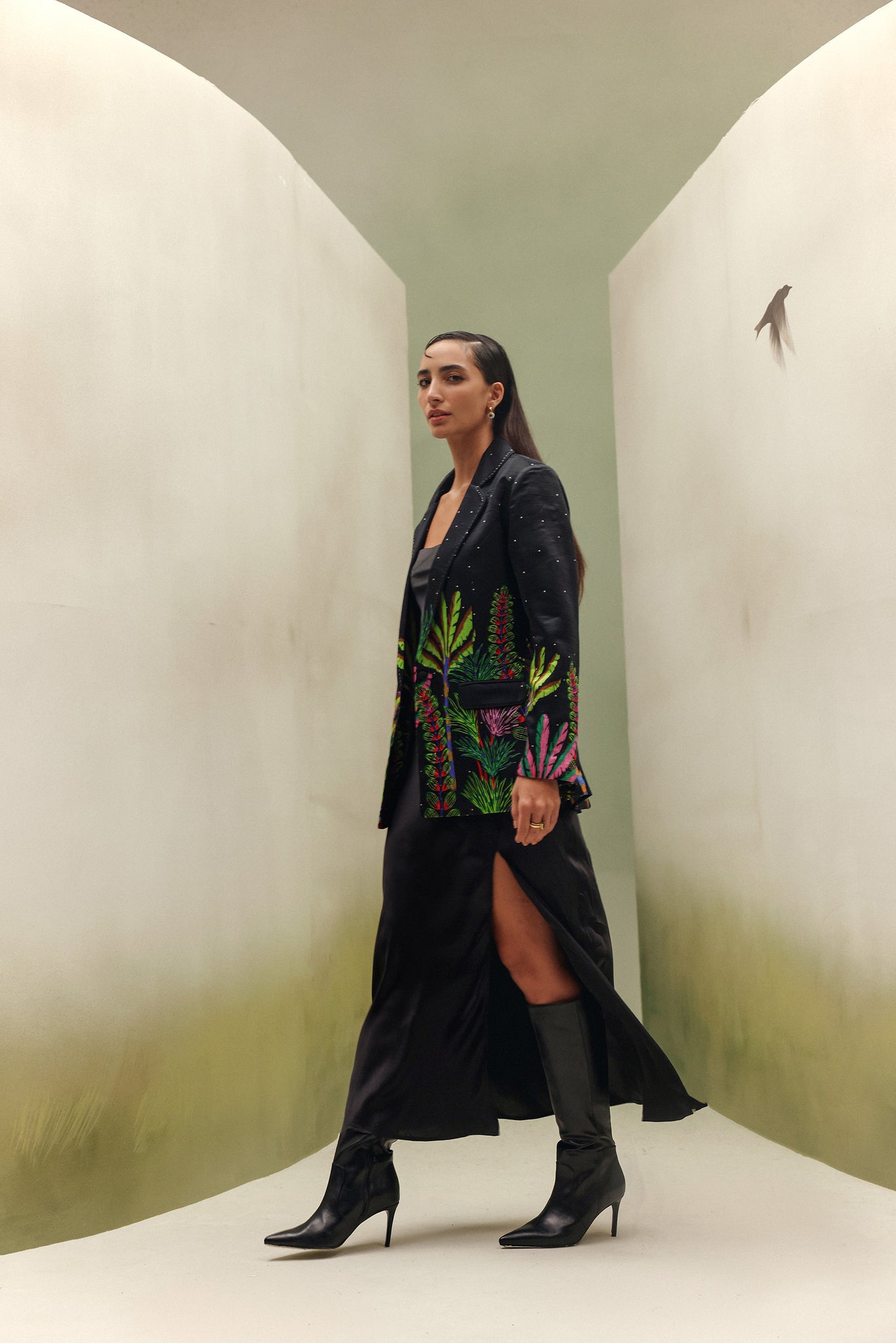 Metallic thread detailing along the lapel adds subtle artisanal texture