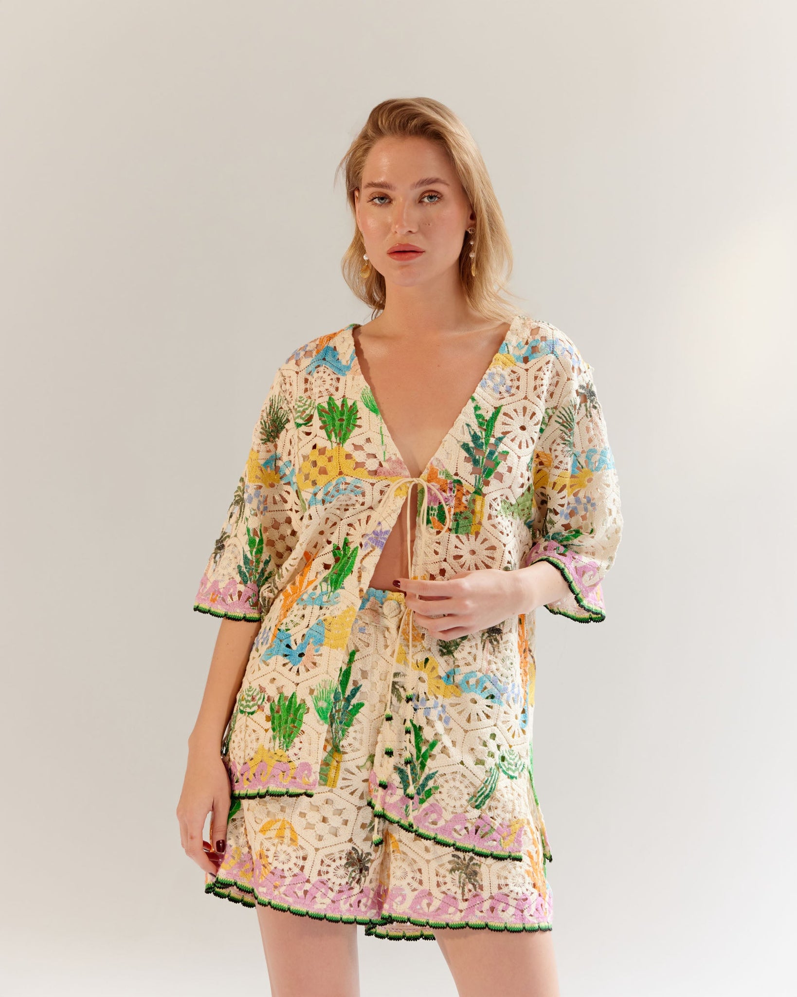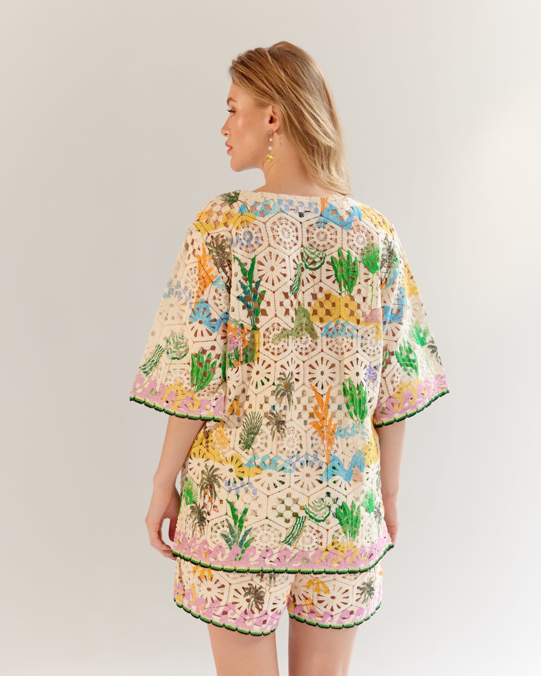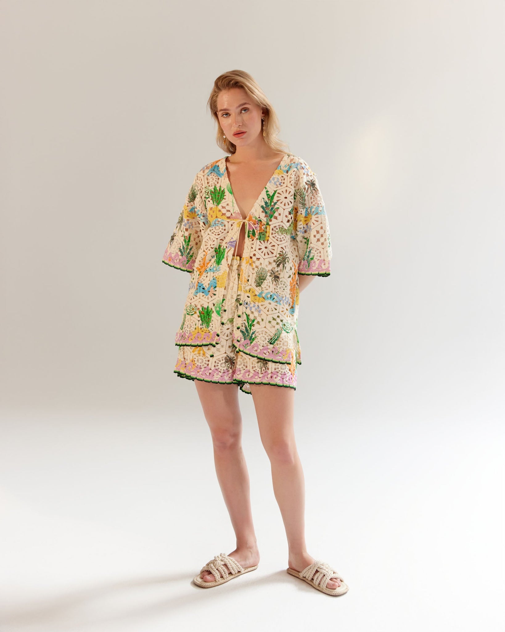Deya Shorts - By the Sea:- The Deya Shorts are a perfect blend of comfort and style. Available in two eye-catching variations—Postcard and By the Sea—these shorts feature intricate placement prints on textured crochet fabric, making them a standout piece for the season.