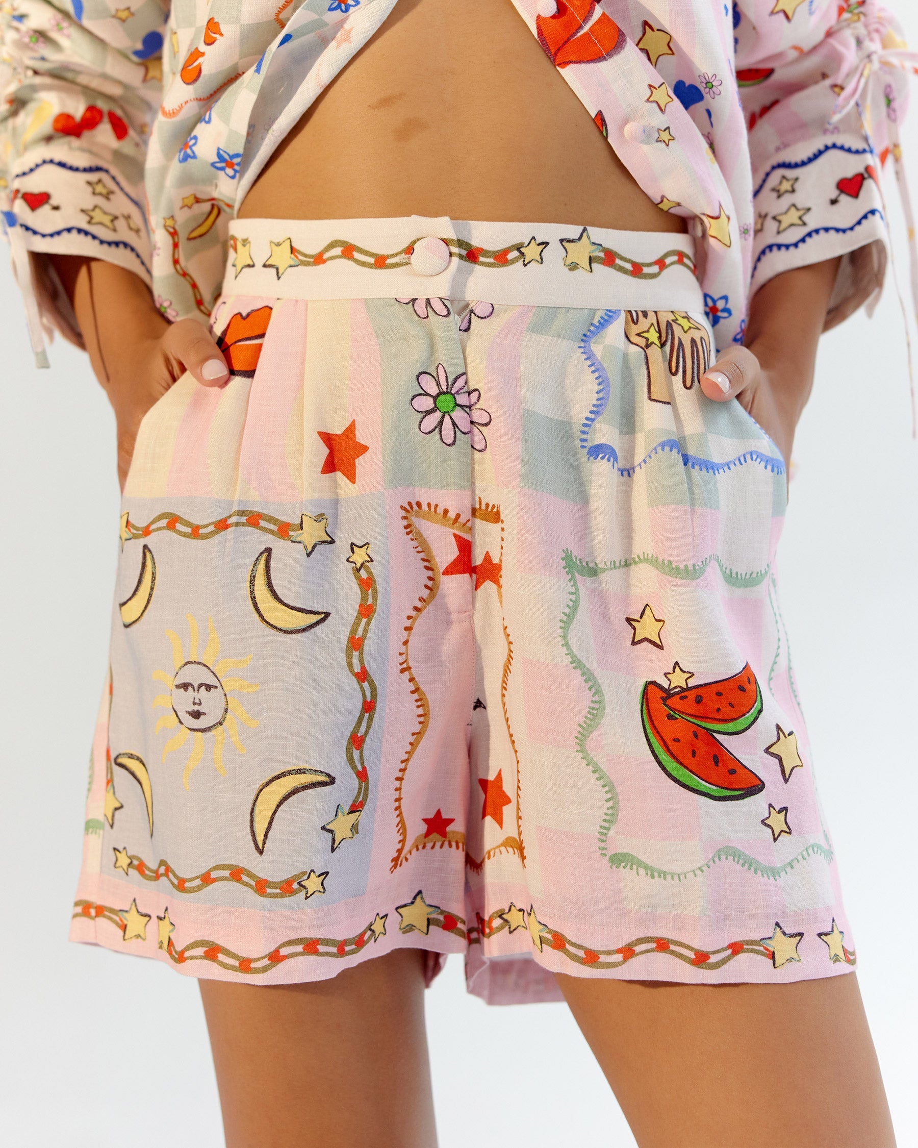 Mia Shorts - Boardgame:- Introducing the Mia Shorts that offer comfort and style in equal measure. Featuring a relaxed yet flattering fit, these shorts are available in three eye-catching variations: By the Sea and Boardgame, with vibrant placement prints on lightweight linen lyocell, and a timeless All-Over Embroidery design on luxurious giza poplin.