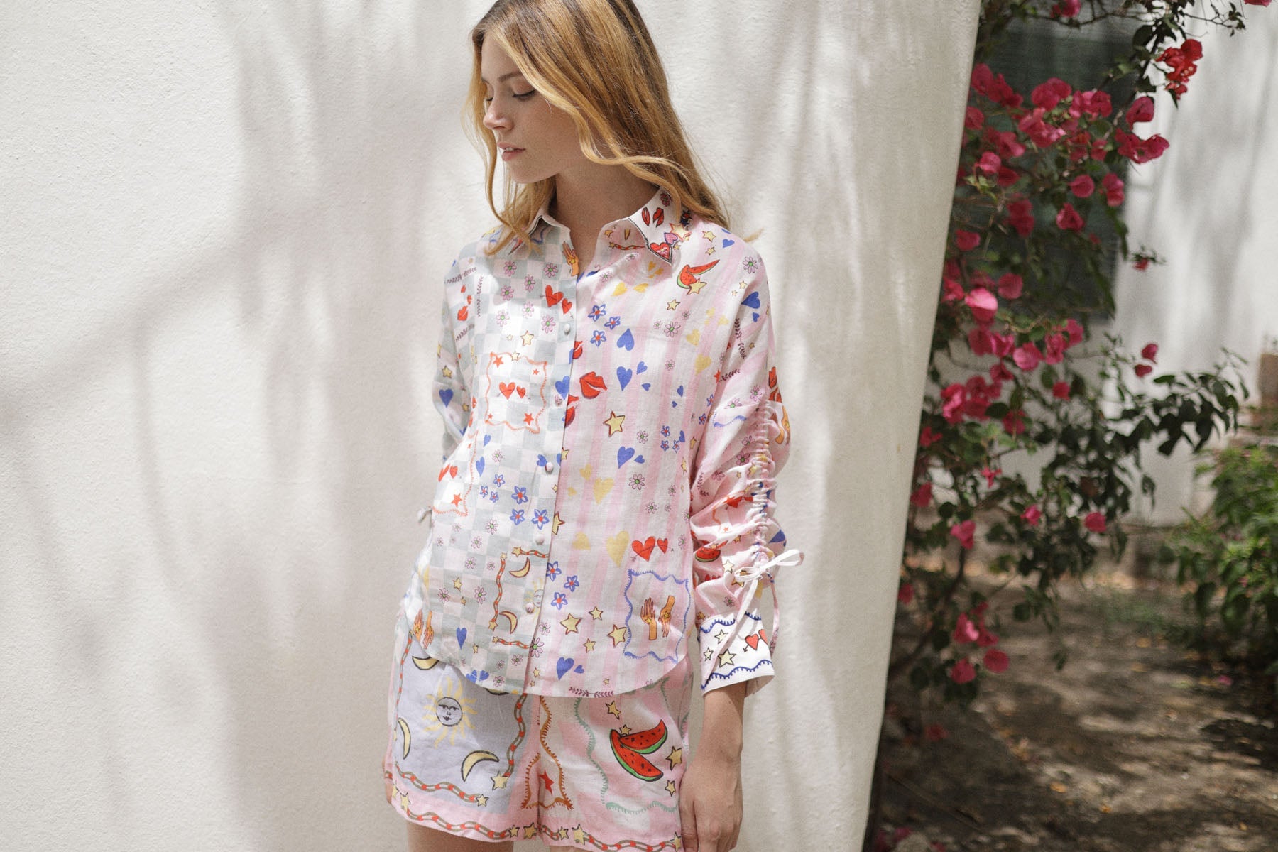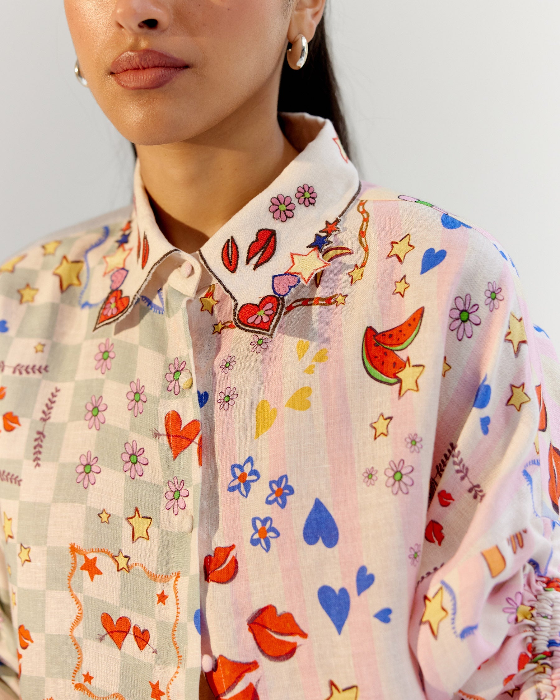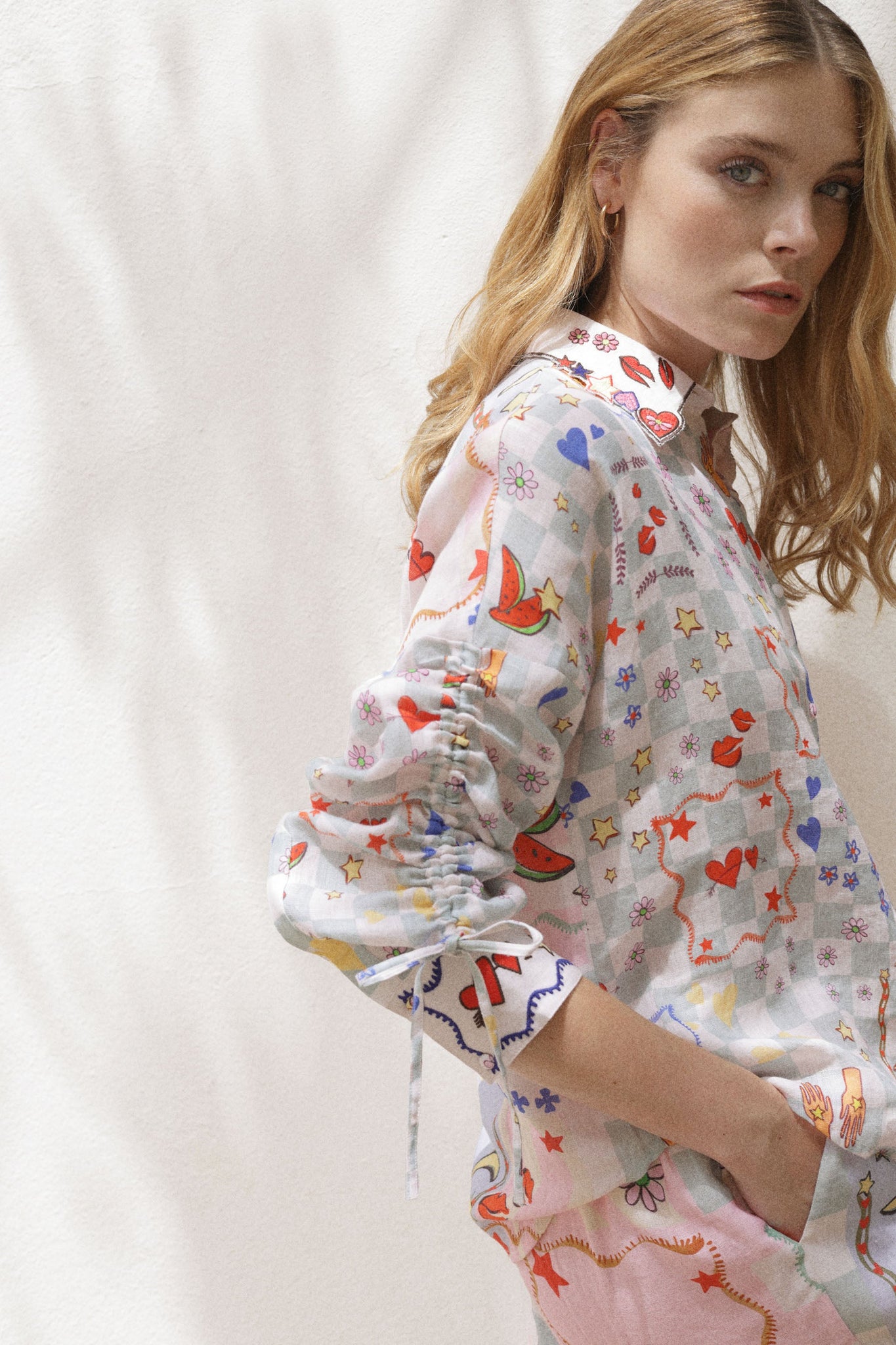 Thais Shirt - Boardgame:- The Thais Shirt, a beloved bestseller from our previous collection, makes its return in two stunning new variations. Crafted for versatility and charm, it is available in Boardgame, featuring vibrant placement printing on linen lyocell with intricate collar and cuff embroidery, and a timeless All-Over Embroidery design on breathable giza poplin. Both styles feature adjustable drawstrings on the sleeves, creating a chic ruching effect that adds a touch of playfulness to its classic silhouette.