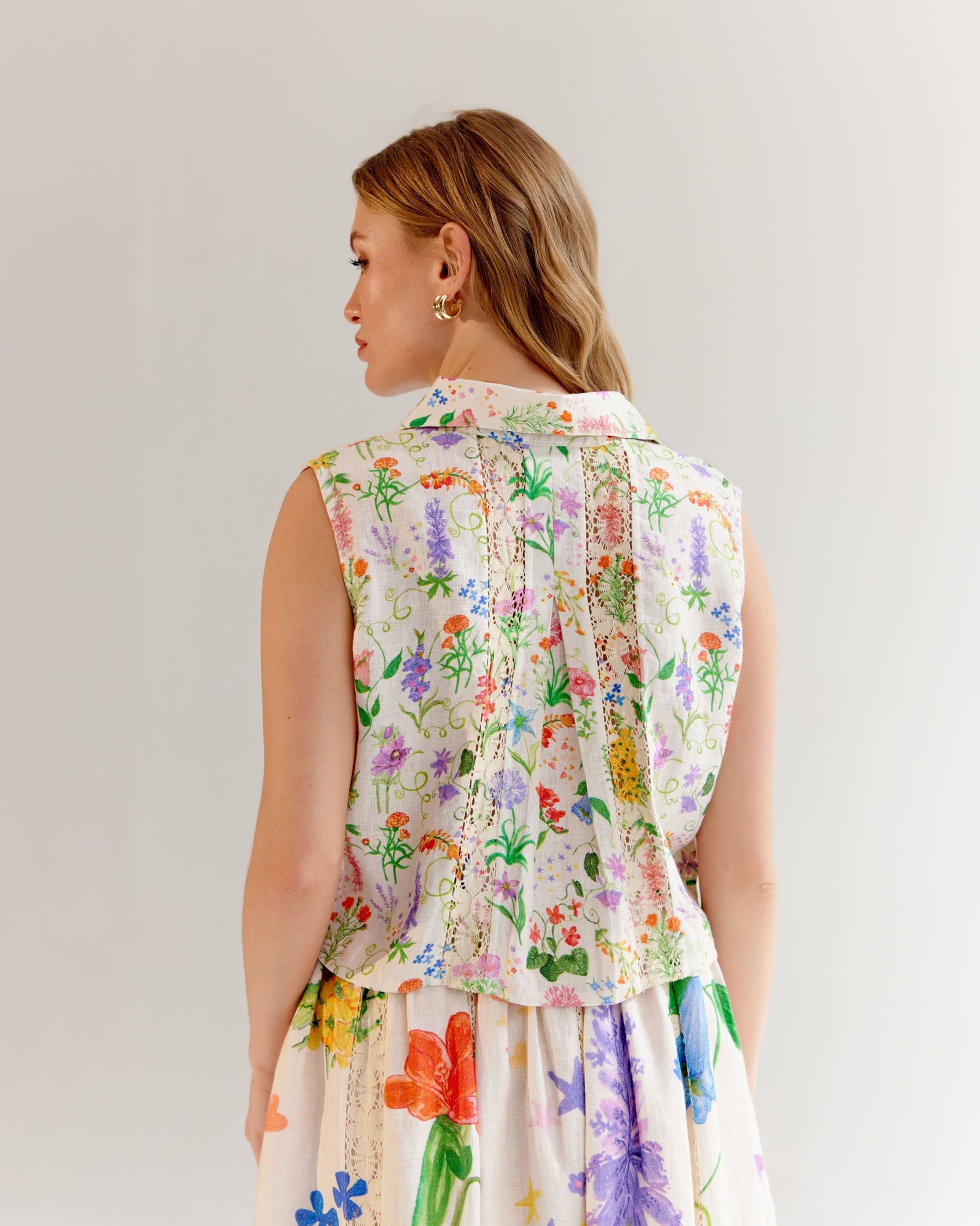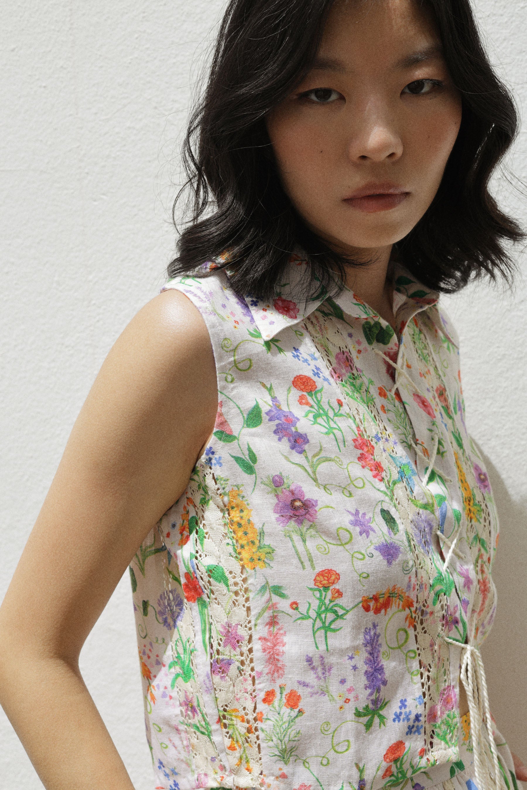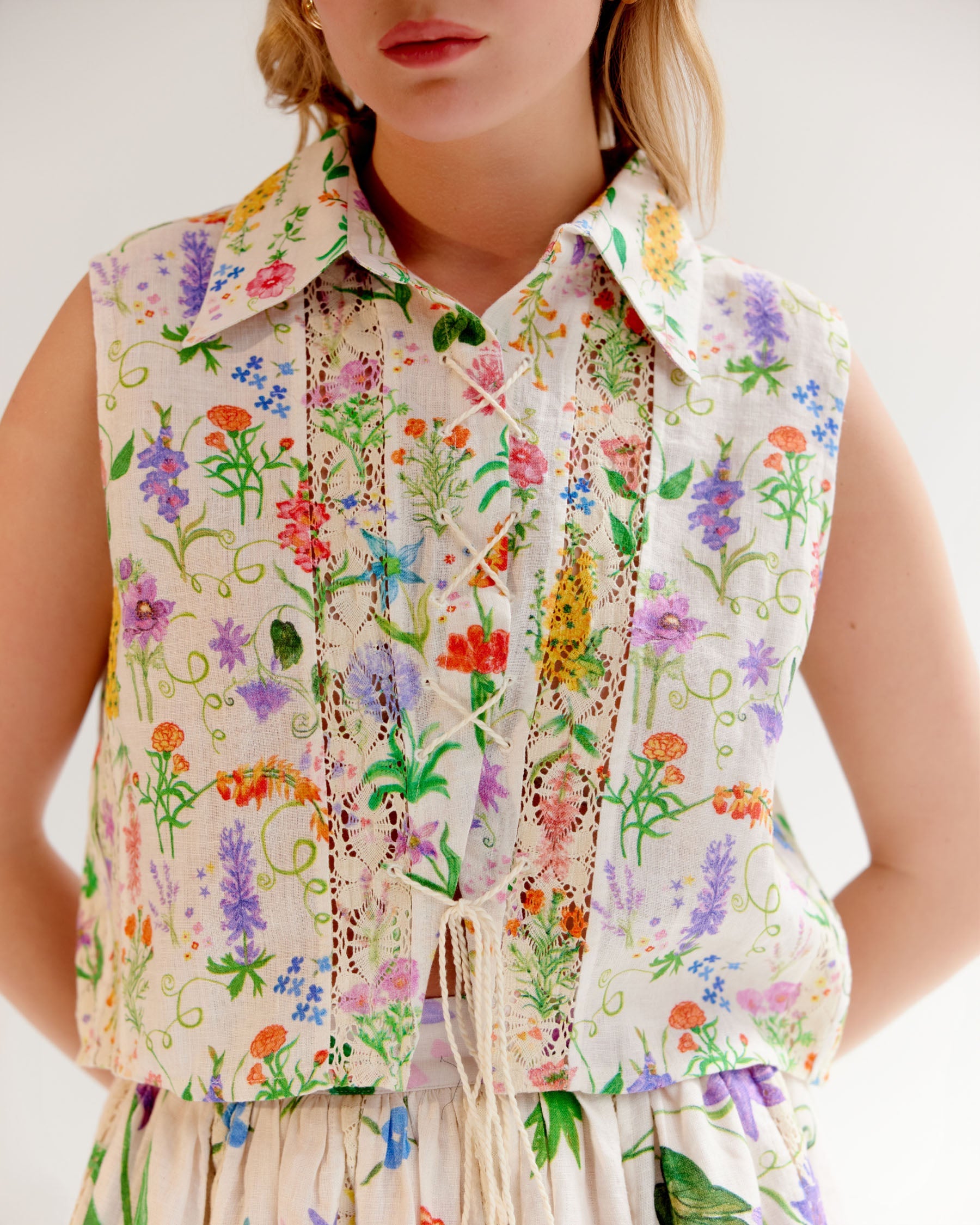 Freya Shirt - Flora:- Introducing the Freya Set that is a perfect blend of elegance and versatility. This shirt-and-skirt set comes in three stunning variations: Landscape and Flora, both featuring vertical lace inserts and vibrant placement prints on breathable linen lyocell, and a classic Schiffli Embroidery design on soft viscose linen. Each sleeveless shirt is thoughtfully designed with criss-cross dori detailing at the front, adding a playful yet refined touch.