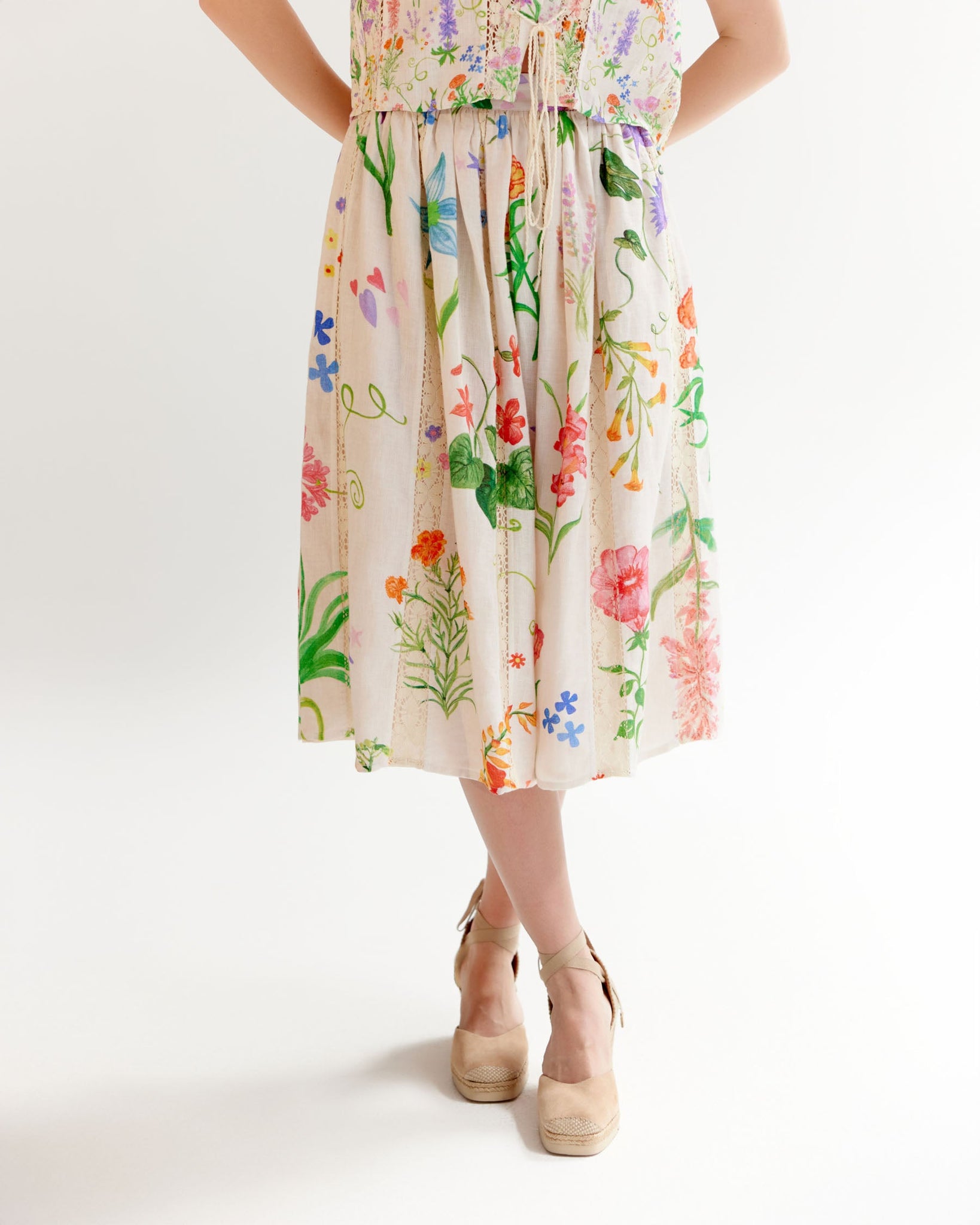 Freya Skirt - Flora:- Introducing the Freya Set that is a perfect blend of elegance and versatility. This shirt-and-skirt set comes in three stunning variations: Landscape and Flora, both featuring vertical lace inserts and vibrant placement prints on breathable linen lyocell, and a classic Schiffli Embroidery design on soft viscose linen. Each sleeveless shirt is thoughtfully designed with criss-cross dori detailing at the front, adding a playful yet refined touch.