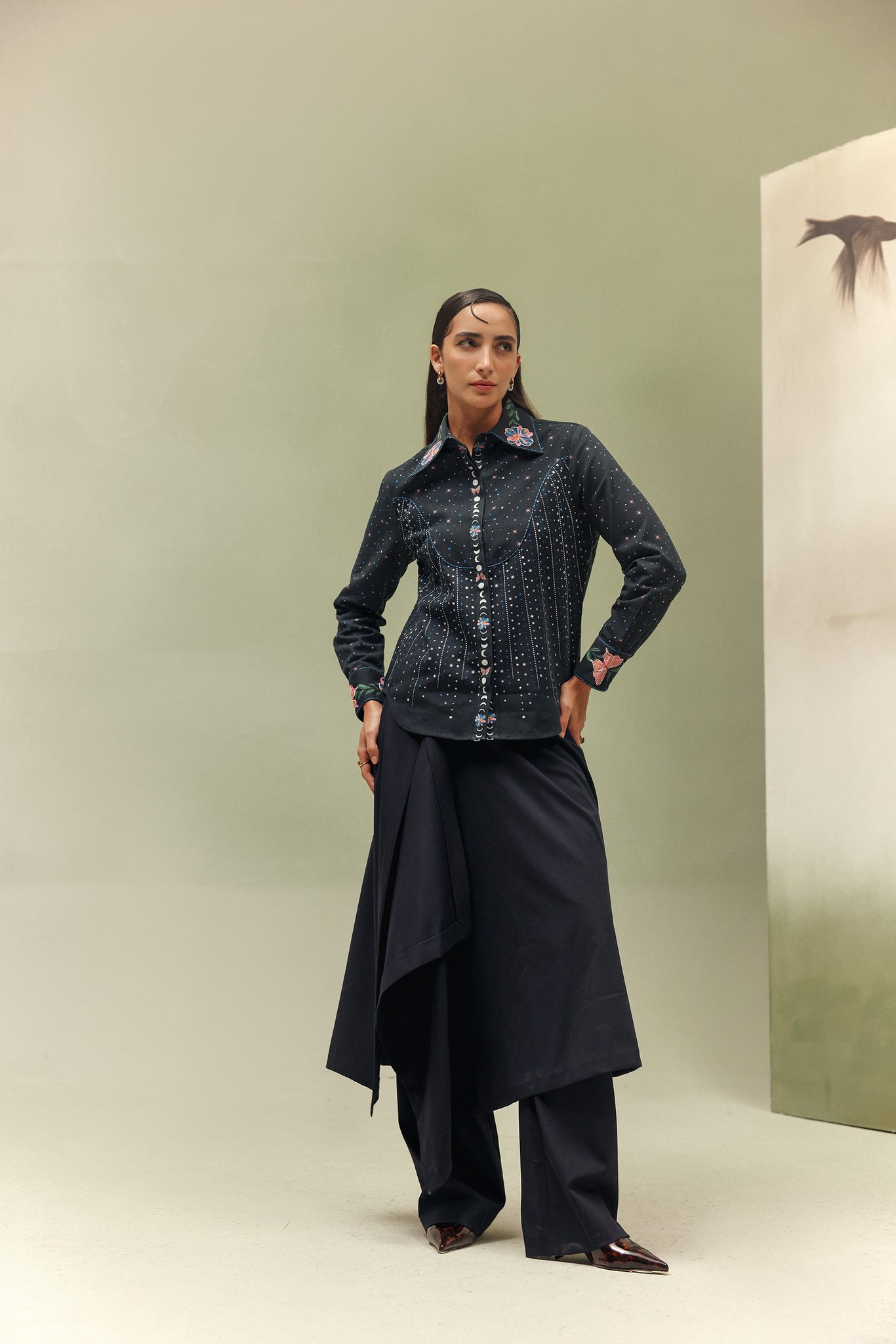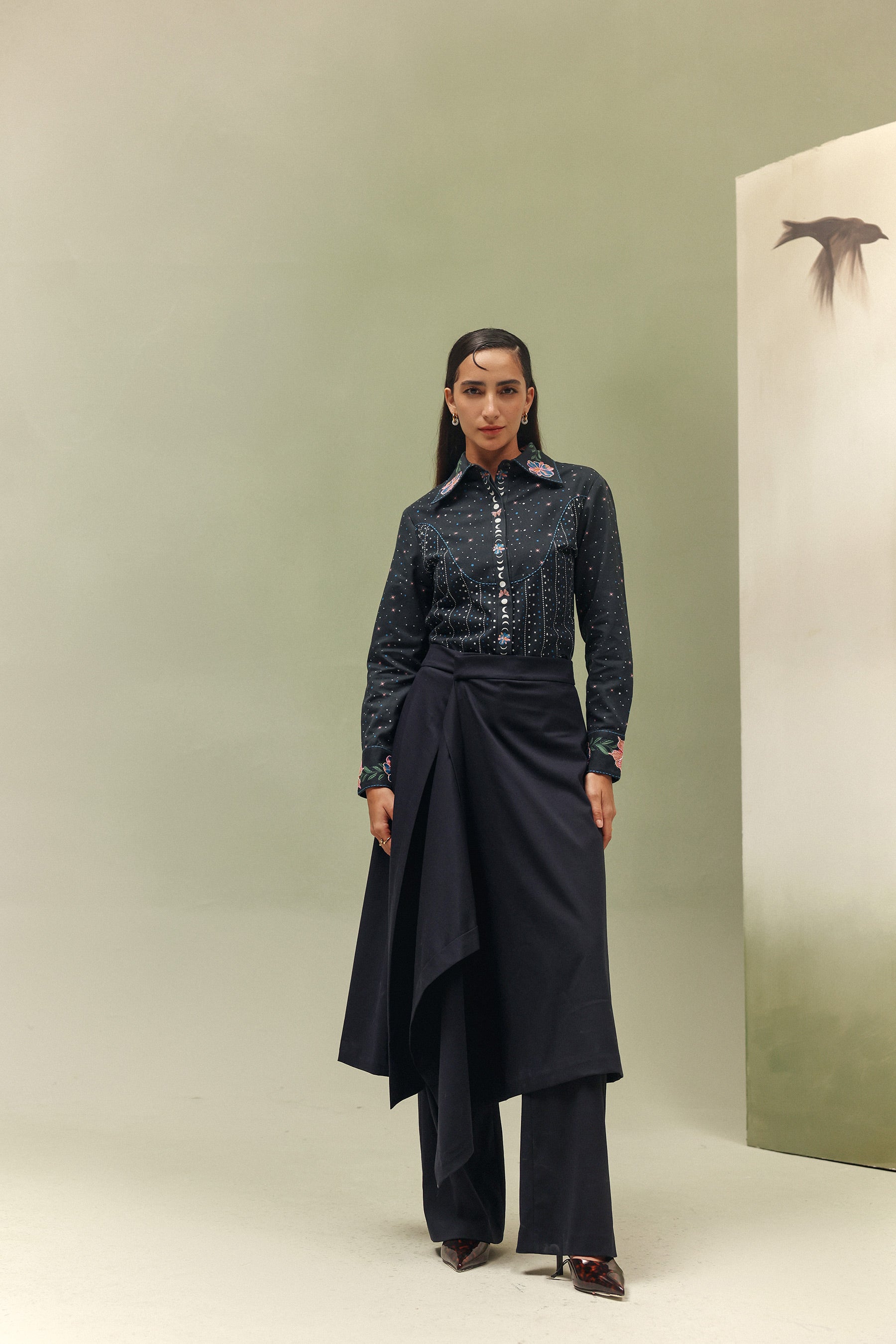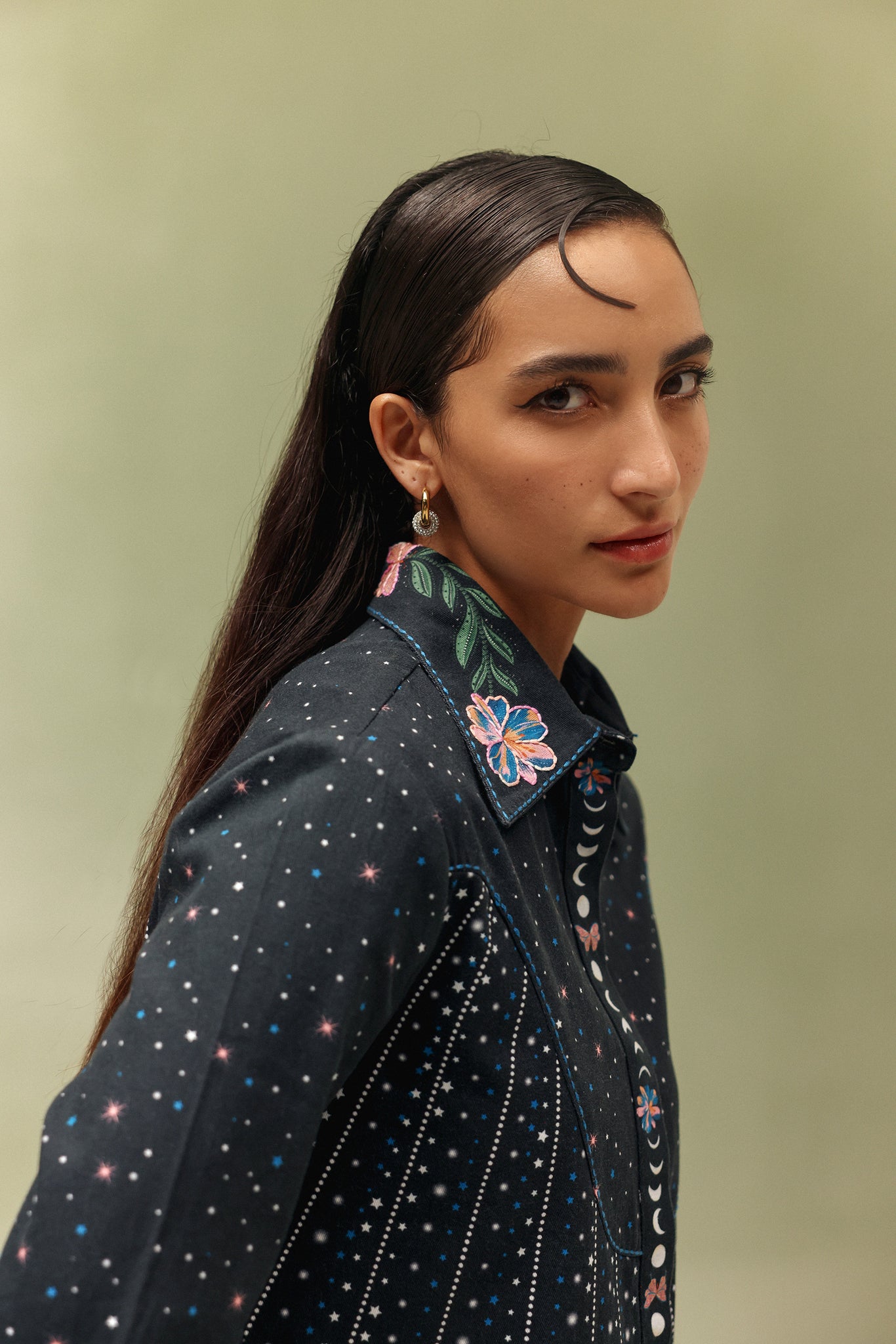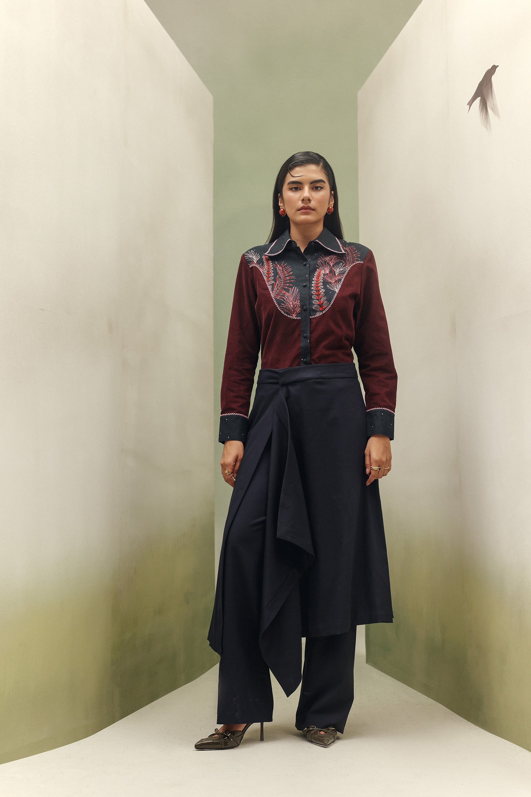 Hand embroidery along the collar, cuffs, and yoke adds artisanal detail