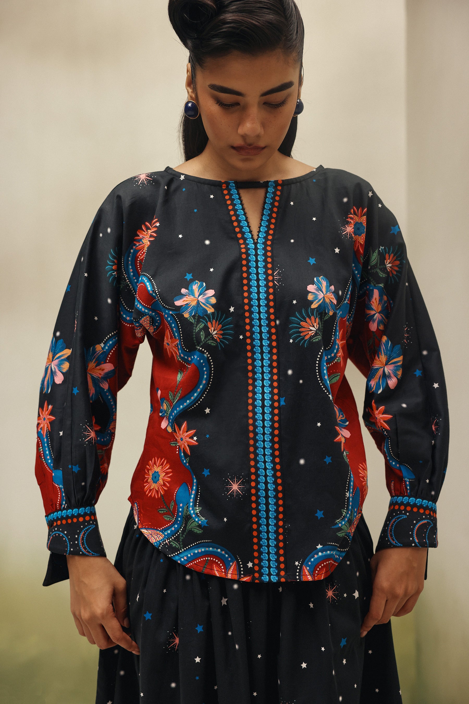 Elle Top crafted in soft cotton satin with subtle placement printing for visual interest