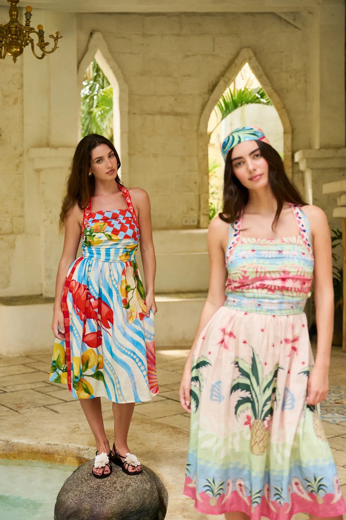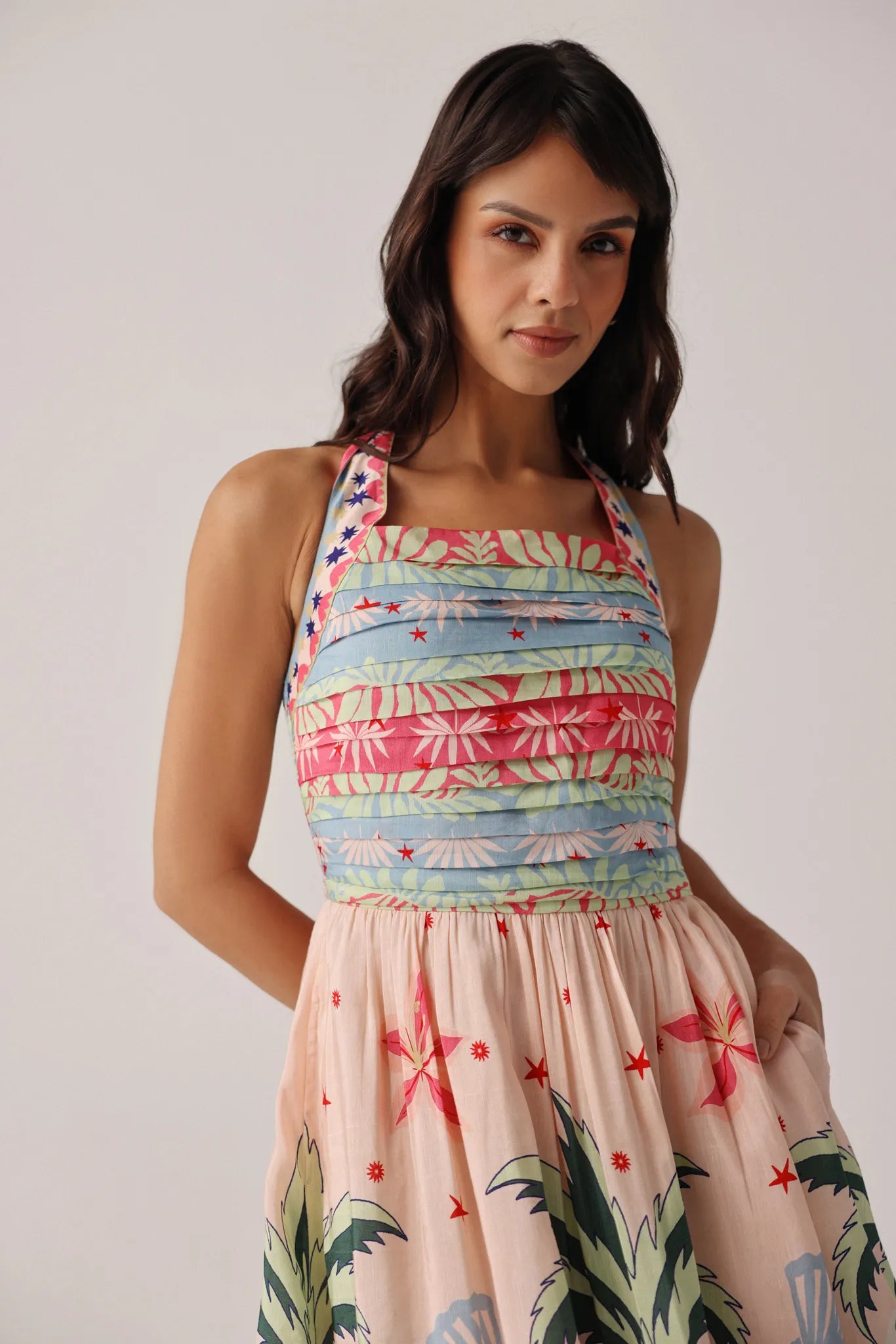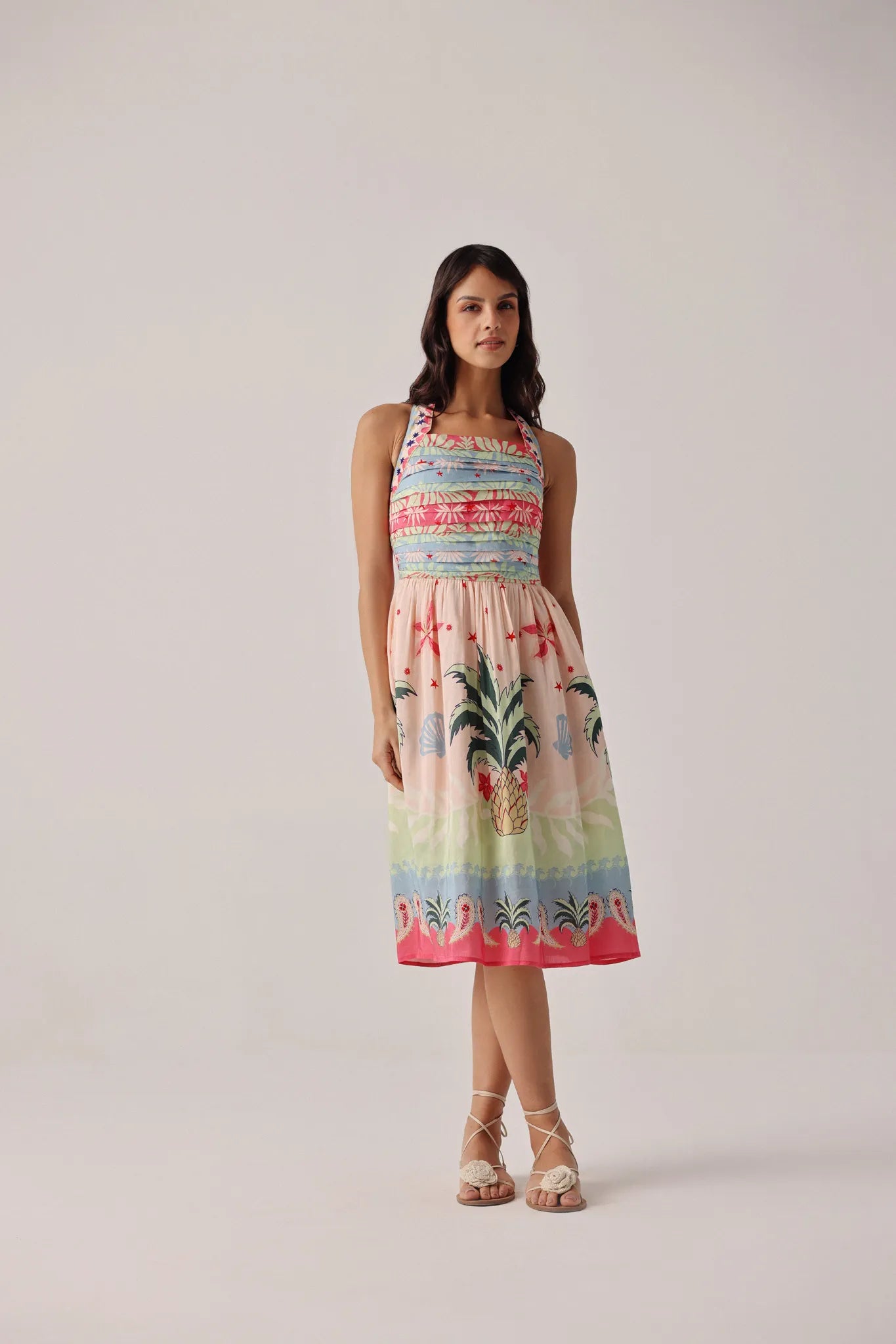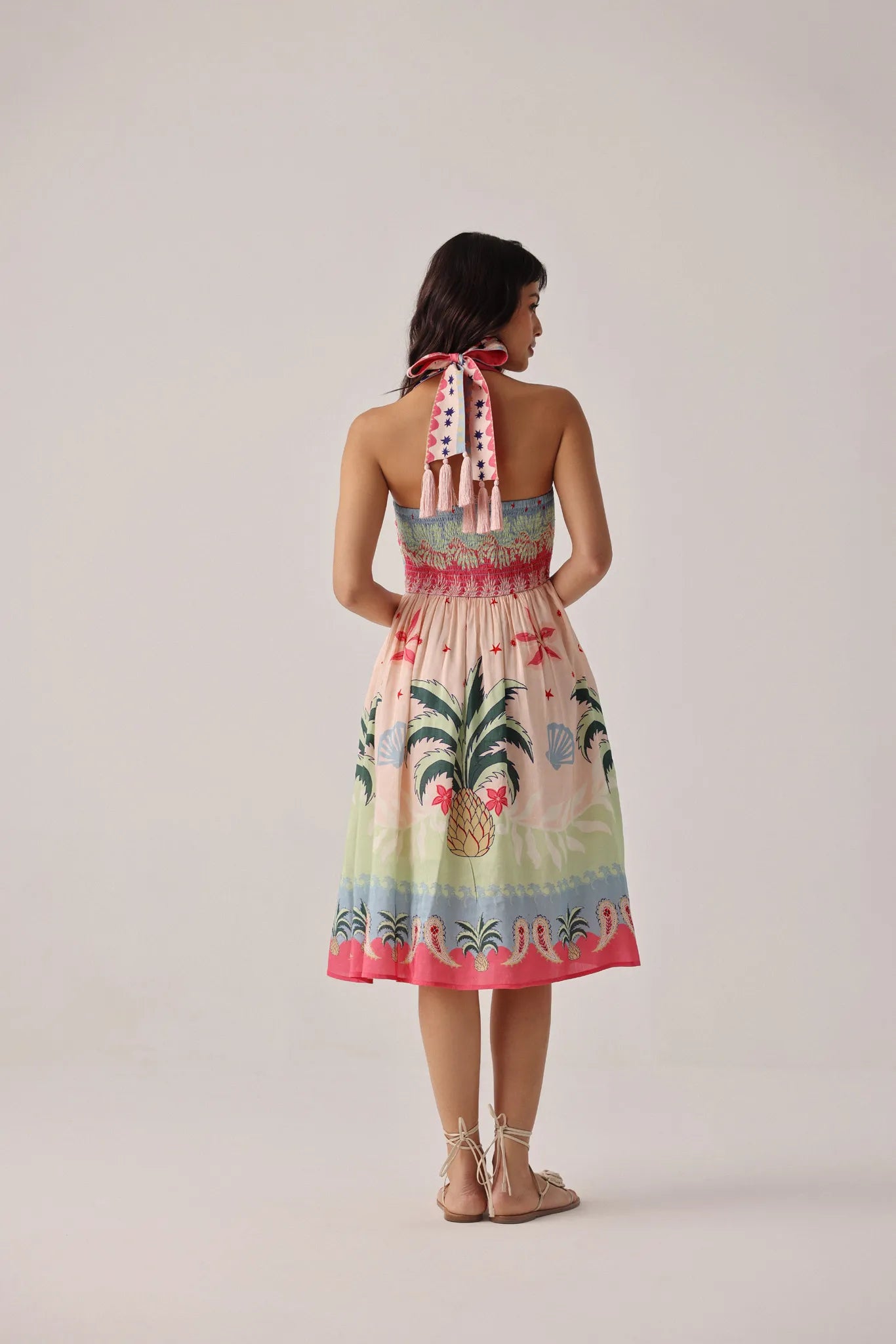Halter-neck midi dress silhouette with tie-up neckline and soft flared hem