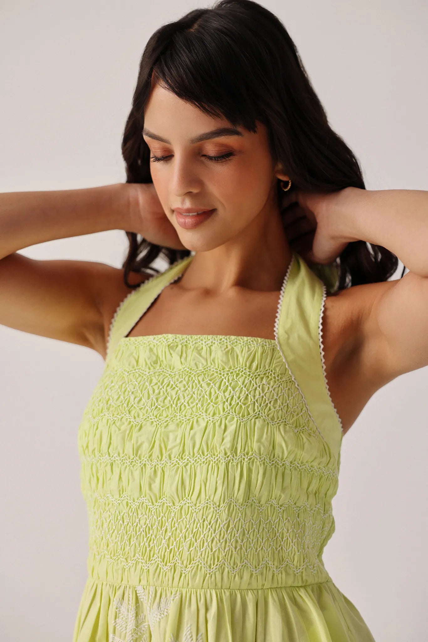 Halter-neck midi dress silhouette with tie-up neckline and soft flared hem
